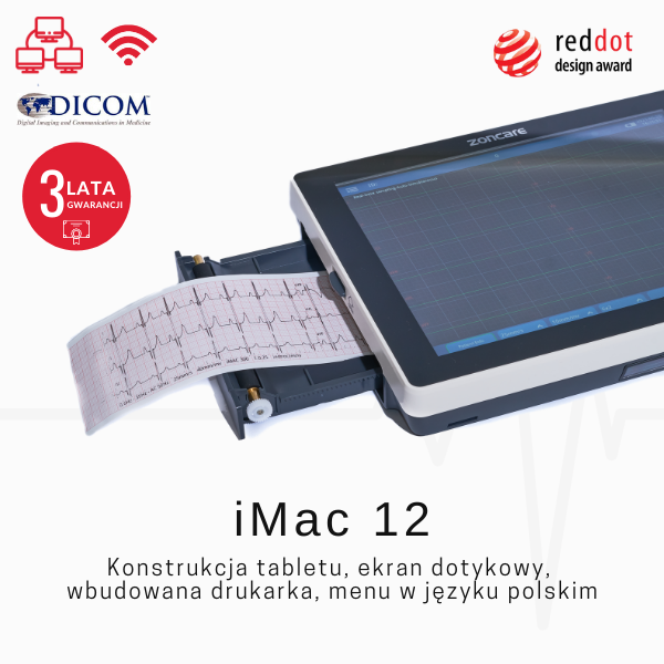 Zoncare iMAC 12 to 12-odprowadzeniowy elektrokardiograf o wyjątkowej konstrukcji tabletu z wysokoczułym ekranem dotykowym. Ten najlżejszy na rynku aparat do EKG dzięki zastosowaniu oryginalnej technologii filtrowania iFilter oraz częstotliwości próbkowania 32.000 Hz, zapewnia doskonałą jakość sygnału EKG. Mało tego bardzo szerokie pasmo przenoszenia 0,01-350 Hz pozwala na uzyskiwanie dokładnych zapisów od pacjentów takich jak osoby starsze oraz dzieci.