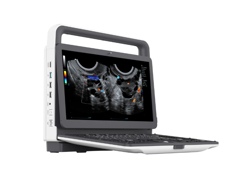 Dodatkowo urządzenie wyposażono w ergonomiczny, 15,6-calowy ekran LCD z możliwością obrotu o 75° oraz podświetlaną klawiaturę. Dzięki temu diagnostyka staje się komfortowa nawet w trudnych warunkach oświetleniowych, a operator może dopasować ustawienie monitora do indywidualnych potrzeb. Demontowalny uchwyt sond i bateria to kolejne elementy, które zwiększają wygodę transportu i codziennego użytkowania.